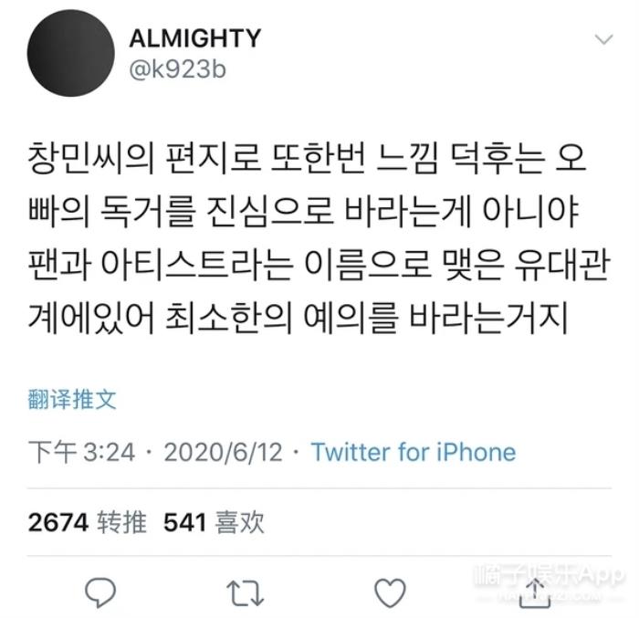 翻译:“读了昌珉的信再一次感受到是,粉丝其实不是真的希望欧巴不要结婚,我们是以粉丝和明星的名义建立起的纽带关系,只是希望能得到最起码的礼仪吧。”