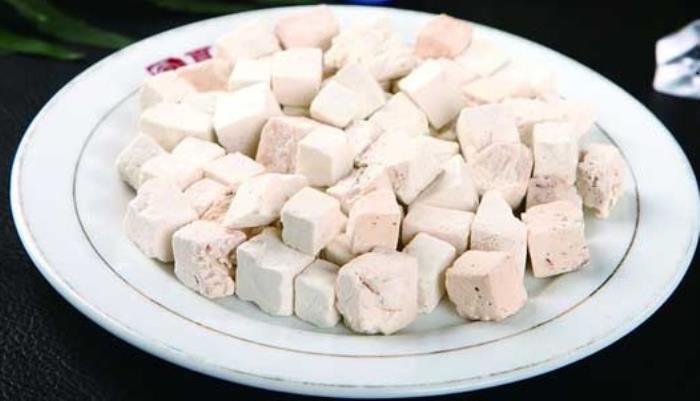 因为茯苓是药食两用的药物,日常生活中就有很多用到茯苓保健功能的食品,比如老北京的特产里就有一款茯苓夹饼。但是,据说茯苓夹饼中没有茯苓,茯苓酸奶里也没有茯苓,基本添加量少到可以忽略不计。据我所知,茯苓在粥里是很难熬透的,因为在熬过的中药里,茯苓块除了染了色还是原样不动的,有次我把中药里熬过的茯苓块拿出来敲开看,有的小块里面甚至还是干的。我们姑且认为全部湿润了的茯苓块,其中有效成分已经在熬煮中被提取了出来,且在复方中发挥了应有的作用,但是单一味药的茯苓,做为食品保健的话,怎么吃才好呢?