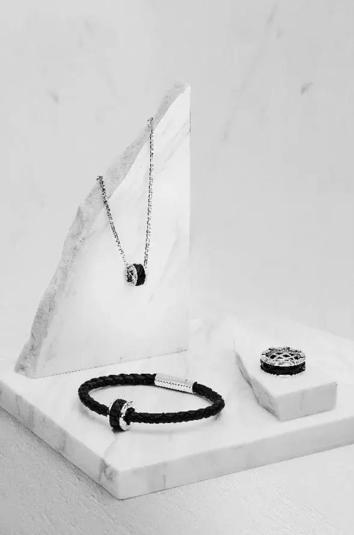 成套的黑玉髓吊坠与手绳相得益彰,白金链条与圆柱吊坠设计简约,玉髓表面加入菱形的细节设计冲破单调。