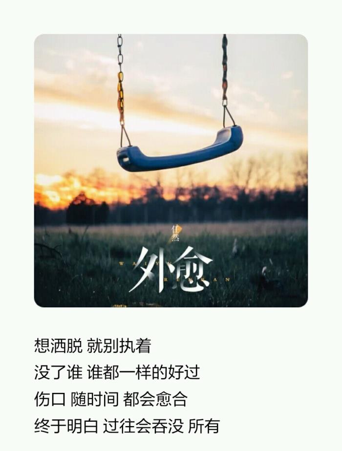 《外愈》也是任然早期的歌了,任然的声音很有特色,声音强硬透着一股忧伤沙哑,很有故事感。做个洒脱的人,执着过去终究也换不回什么。时间是世上最好的疗伤圣药,与其花时间悲伤,不如更好对自己,没有他,我们不也照样活着,而且还要活得更精彩。