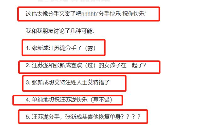 有网友专门开帖子给出了如下几种猜测,来看看两个人究竟怎么了。难道张新成和汪苏泷分手了?汪苏泷和张新成喜欢(过)的女孩子在一起了?张新成艾特汪姓人士艾特错了?