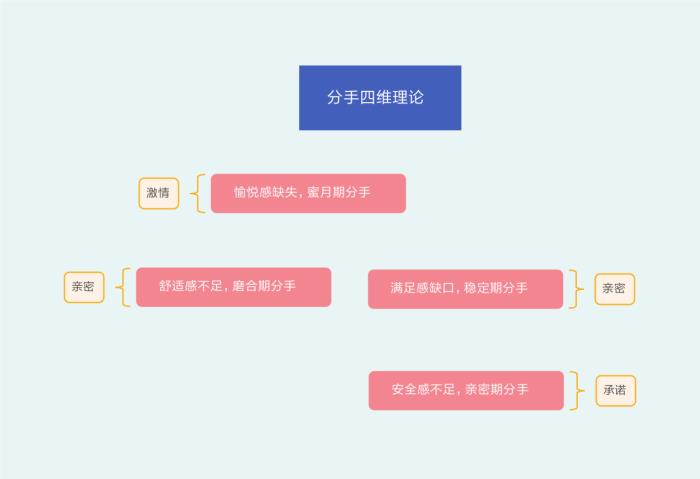 根据爱情三角理论,"激情"会刺激愉悦感产生,"亲密"带来了舒适感和满足感,而"承诺"让彼此充满安全感。由此我们可以推导出分手四维理论:爱情中最基础的四种感觉,愉悦感,舒适感,满足感和安全感,哪一个维度的感觉被破坏了,分手就近在眼前了。