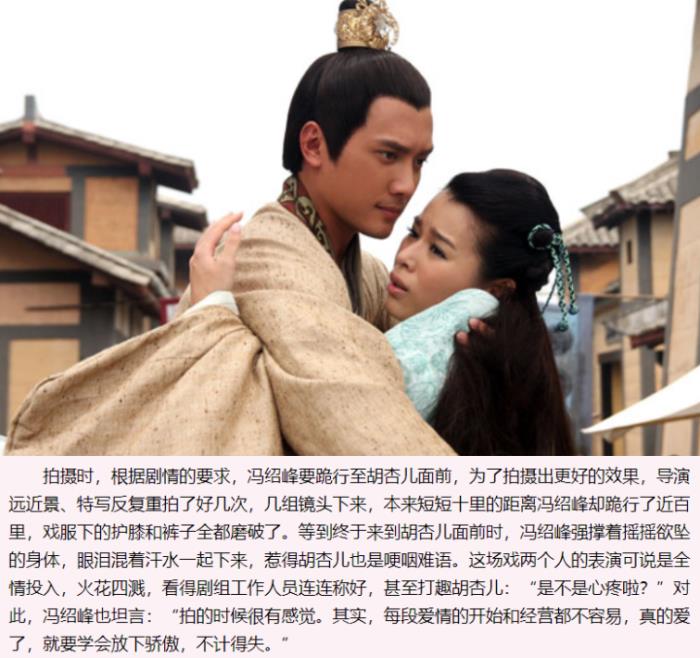 2010年冯绍峰和胡杏儿在《美人心计》中演对手戏,一场跪地前行的戏冯绍峰足足演了十多遍,膝盖都磨破了,整个人精神状态有点恍惚。