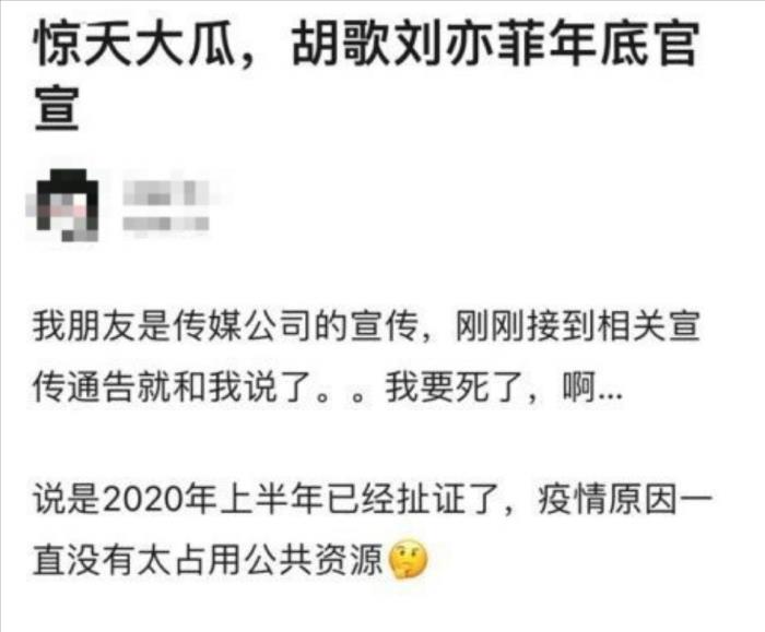 爆料人声称自己朋友是传媒公司的,告诉他其实胡歌和刘亦菲2020年上半年就扯证了,但因为疫情原因,不想占用公共资源,所以一直没有机会公布。