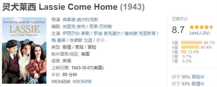 挺温馨的电影,莱西不顾危险跋涉千里回到主人身旁;它和它的几个主人所体现出来的真挚情感也让人感动,其中有的地方让我体会到“善意的谎言”的真意。小时候的伊丽莎白·泰勒在本片初露头角,挺可爱的。
