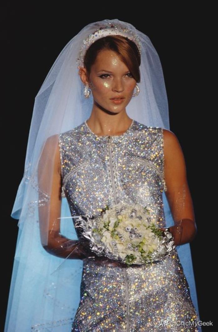 这是在1996年的Gianni Versace伸展台上。传奇超模凯特·摩丝身上镶满钻石的长裙,可能有点不切实际又有点争议。但这身摇滚风+《了不起的盖茨》电影元素的设计,却经常出现在新娘的情绪板上。