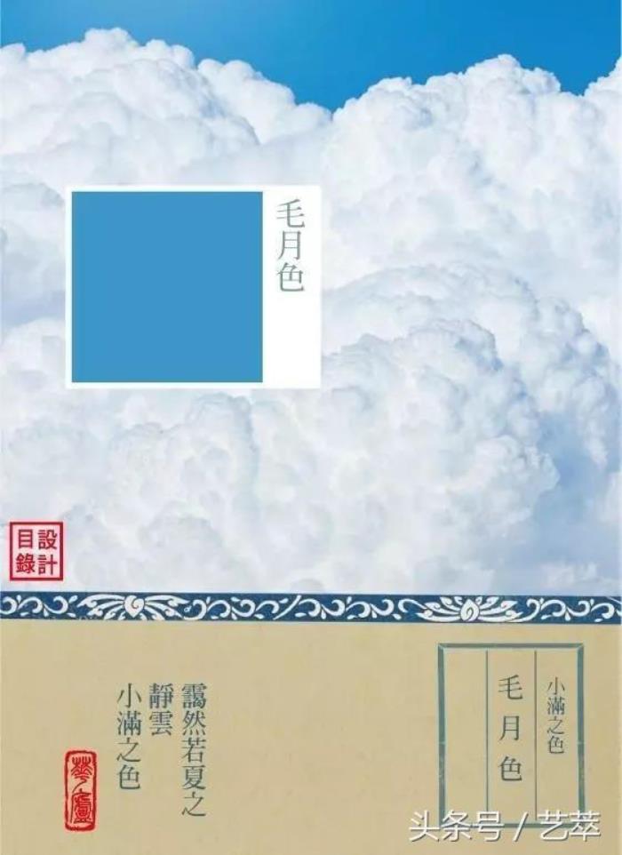 这个名字真的有些让人摸不着头脑,毛月难道指长毛的月亮吗?毛月其实和月亮无关,而是与天空有关,毛月色是天空的颜色,是蓝色。而且,毛月色还是二十四节气之一的小满的颜色。“四月中,小满者,物致于此小得盈满”,“立夏天空澄净绿荫浮云,故为毛月色描之”。