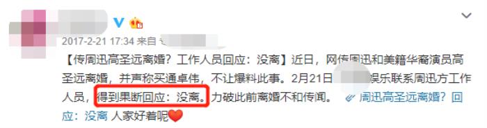 这样模棱两可的态度,和周迅方之前的反应却完全不同。周迅高圣远两人自2014年结婚以来,曾多次传出婚姻关系破裂,一向鲜少在公众面前回应私事的周迅,2017年2月却破天荒用两个字"没离",强硬表明了自己的态度。