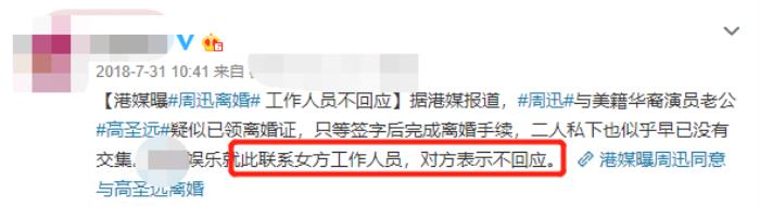 2018年7月31日,有香港媒体曝出消息称,周迅和美籍华人演员老公高圣远已经协商离婚,并领取了离婚证,只差找到合适的机会公开,而二人私下早已没有交集。随后,有内地媒体致电周迅方工作人员,却得到了"不回应"的答复。