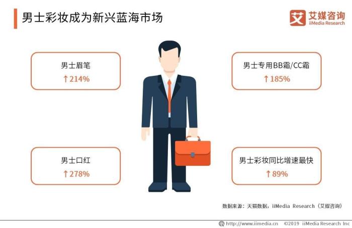 2018年全年男士化妆品类销售中,彩妆品销售额的同比增长速度居于化妆品类之首,高达89.0%。其中,男士眉笔增速达214.0%,男士专用BB霜/CC霜达185.0%。