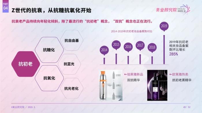 Z世代的抗衰,从抗糖抗氧化开始。由抗初老衍生出多种细分功效,比如抗糖化、抗氧化,还有抗自由基、抗蓝光、抗光老化等,2019年抗初老相关妆品备案数环比增长285%,国货护肤品牌也在积极布局相关产品,比如自然堂和百雀羚今年上半年主推的新品都是抗初老精华,珀莱雅今年推出了双抗精华。