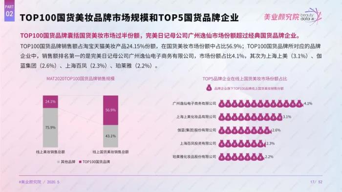 从市场规模来看,TOP100国货品牌销售额在淘宝天猫整个美妆市场占比近1/4,在国货美妆市场份额接近57%。
