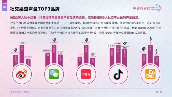 我们研究品牌在不同平台的社交声量指数时发现,TOP100国货美妆品牌中,几乎9成品牌注册有小红书官方账号;抖音视频带货几乎是所有品牌的选择,虽然在抖音注册官方账号的品牌仅5成,但每个品牌都有产品带货视频;在快手平台注册官方账号的品牌不足4成。从各个平台声量TOP3品牌中可以发现,完美日记在各平台拥有较高声量。
