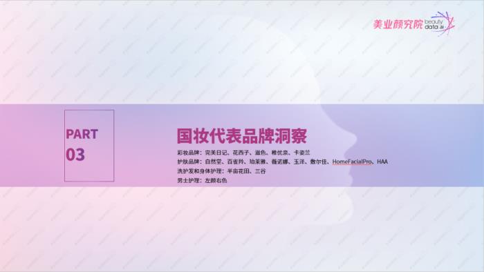 经典国货如何捍卫护城河?新锐国货如何崛起?美业颜究院挑选了5个彩妆代表品牌,8个护肤代表品牌、2个洗护和身体护理代表品牌和1个男士护理代表品牌,分别从竞争格局、渠道升级和发展策略、差异化定位和消费意识觉醒维度进行分析。