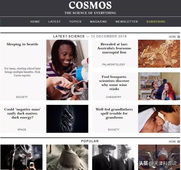 Cosmos: the Science of Everything是一个以澳大利亚为基地的季度印刷杂志,但是其网络版每天都在更新,内容包含了不同学科的科学内容。他们的作者经常在天体物理学领域写出其他地方没有的激动人心的故事。