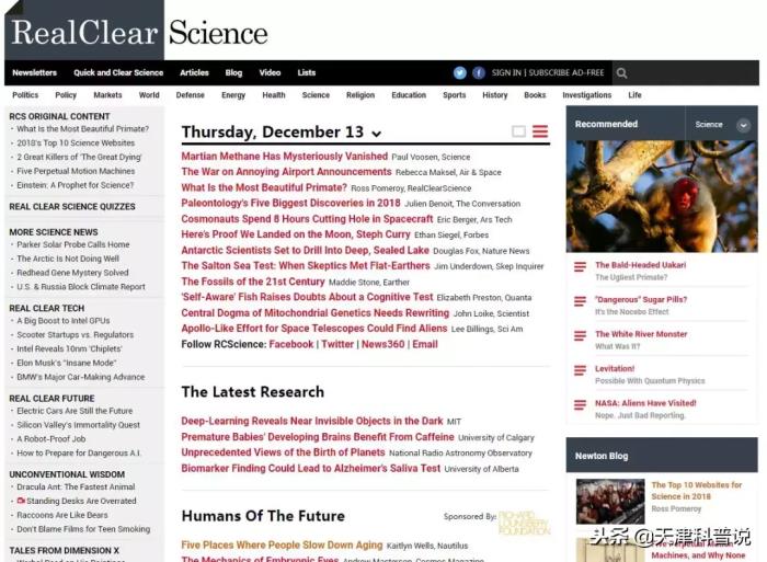 “真实科学”网站(RealClearScience)的工作是过滤掉所有垃圾,为网友带来最相关、最有趣、最准确的科学新闻和观点。在2018年的“世界十大科学技术网站”评选过程中,评委们注意到一些网站脱颖而出。以下是评选出的2018年最受欢迎的科学网站。
