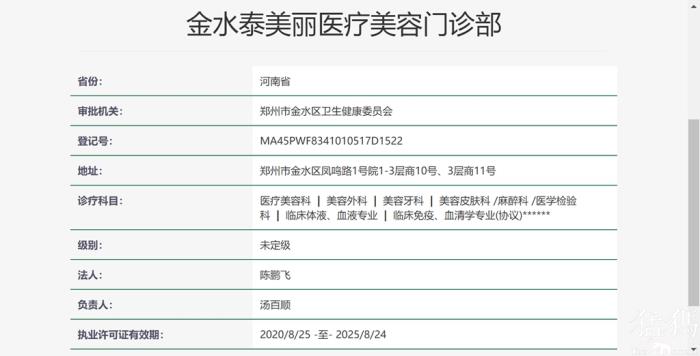 随后,记者从郑州市金水区卫健委了解到,该整形机构备案名为金水泰美丽医疗美容门诊部。记者在国家卫健委网查到了该医疗美容诊所的诊疗科目,包含医疗美容科、美容外科、美容皮肤科/麻醉科等等。