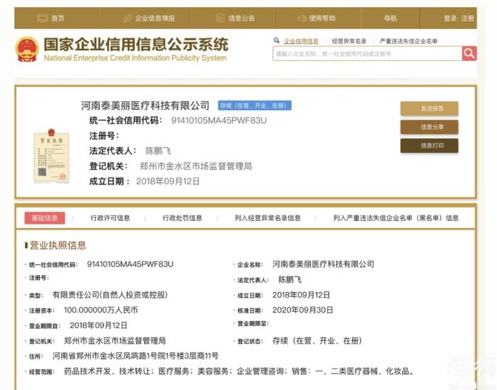 究竟该整形机构是否有医疗机构执业许可证?执业范围是否包含医疗整形等手术项目?记者通过国家信用信息公示系统查询到,河南泰美丽医疗科技有限公司成立于2018年9月12日,注册资本100万人民币,法定代表人陈鹏飞,经营范围有药品技术开发、医疗服务、美容服务等。记者又通过国家卫健委官网查询该机构门店名称“郑州眼鼻修复基地”“泰美丽医疗整形美容”,结果显示未查询到符合条件的医疗机构。