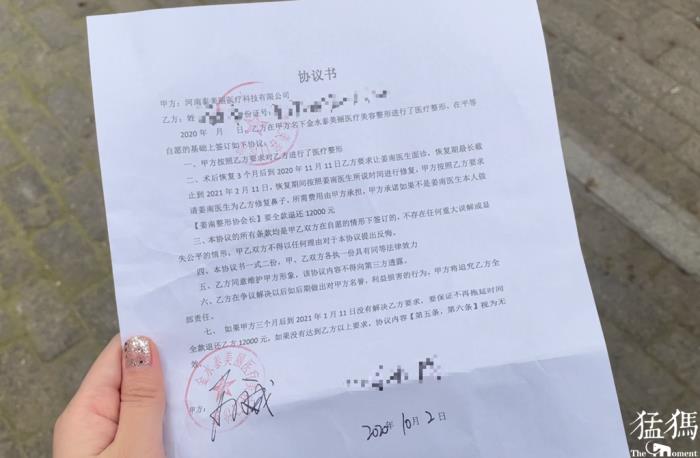 根据司女士展示的双方协议,记者看到她与河南泰美丽医疗科技有限公司的协议内容,其中提到“术后恢复3个月到2020年11月11日要求姜南医生面诊,恢复期最长截止到2021年2月11日”“如果甲方三个月后没有解决乙方要求,要保证不再拖延时间全额退款12000元”。