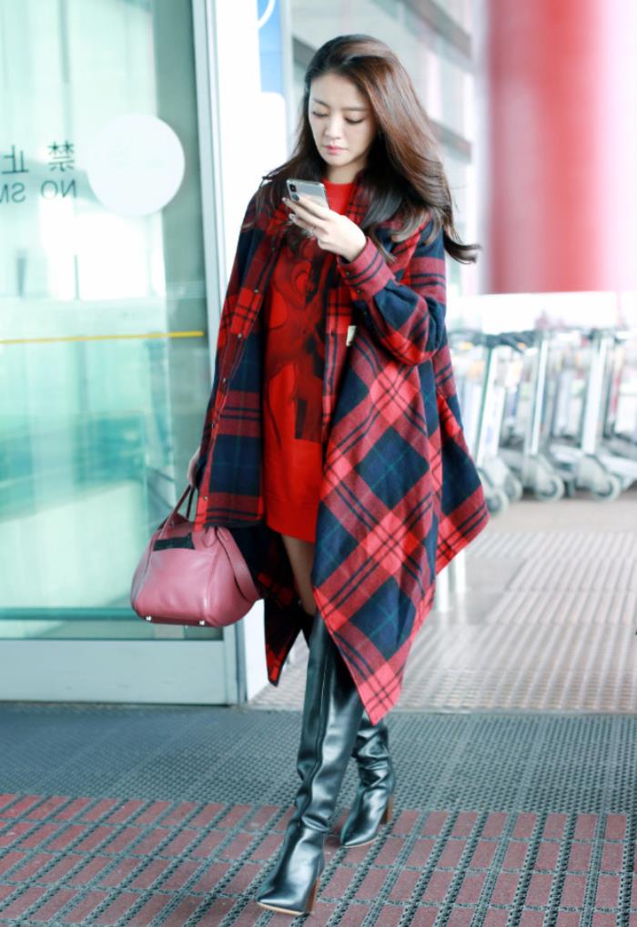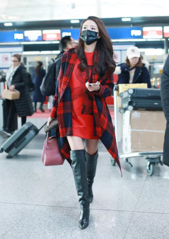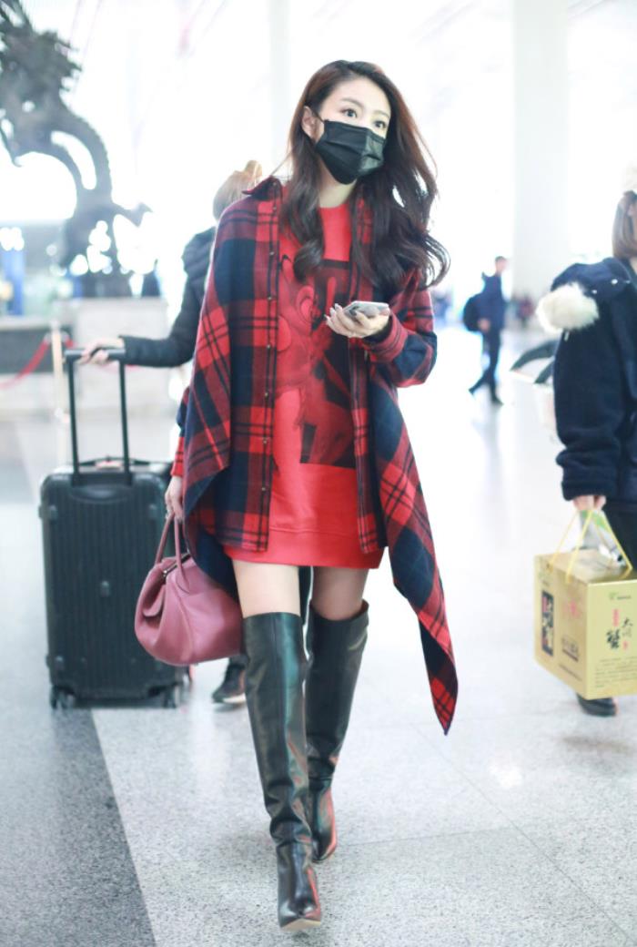 来看看安以轩的这一身造型,她身穿一款红色长款卫衣,外搭一款红色的格纹衬衫,玩起下衣失踪秀出大长腿,搭配一双黑色的过膝长靴,真是帅气又时尚。手上拿一款潮范十足的包包,显得更加酷了。