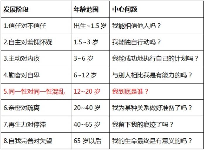 八阶段理论之中,最著名的就是青春期(12-20岁)的"同一性危机"。
