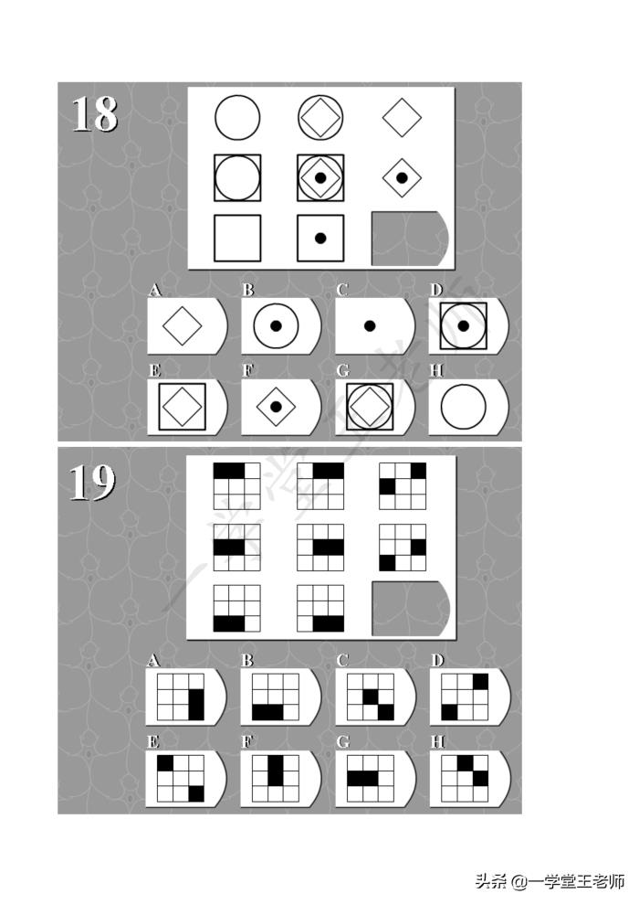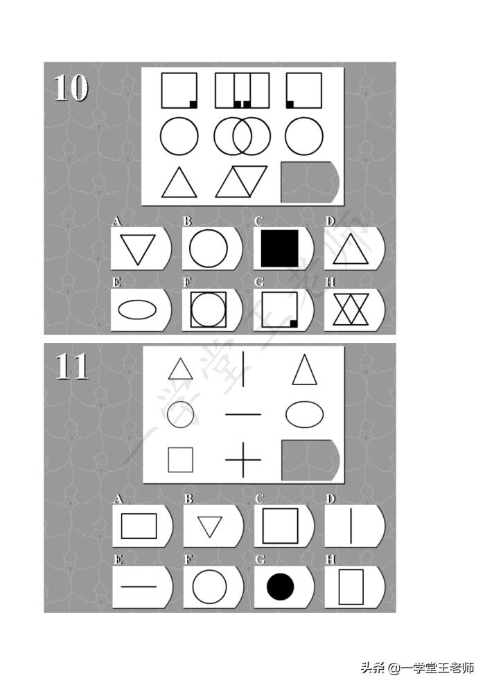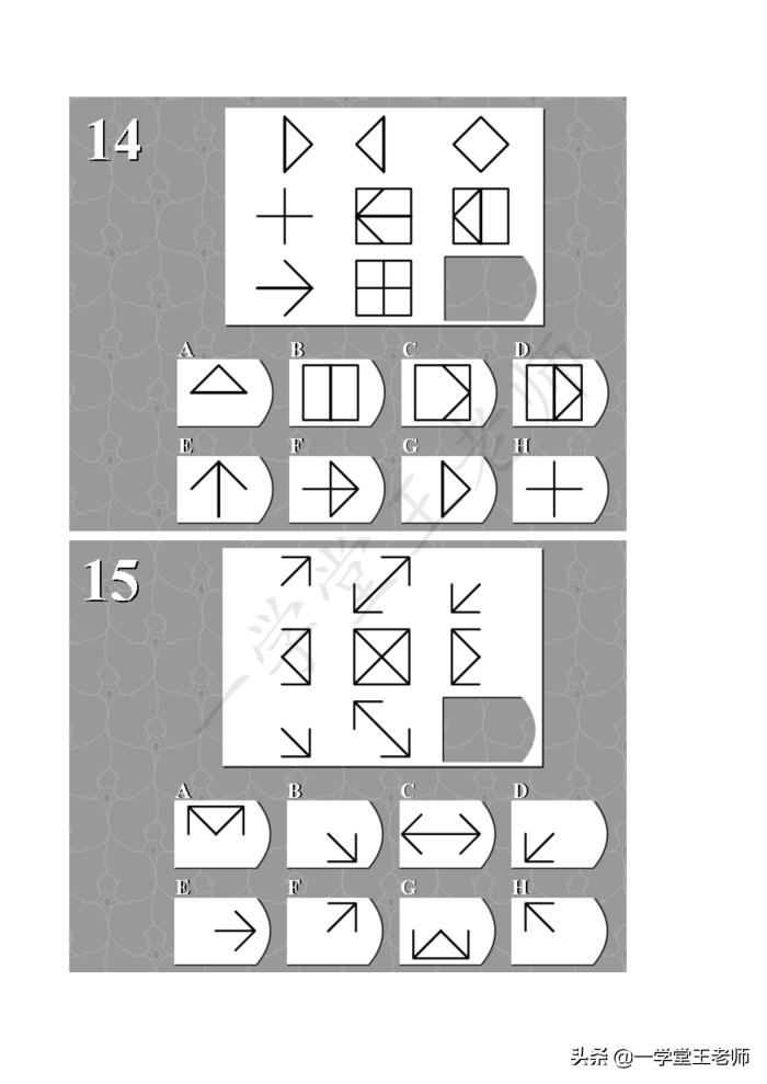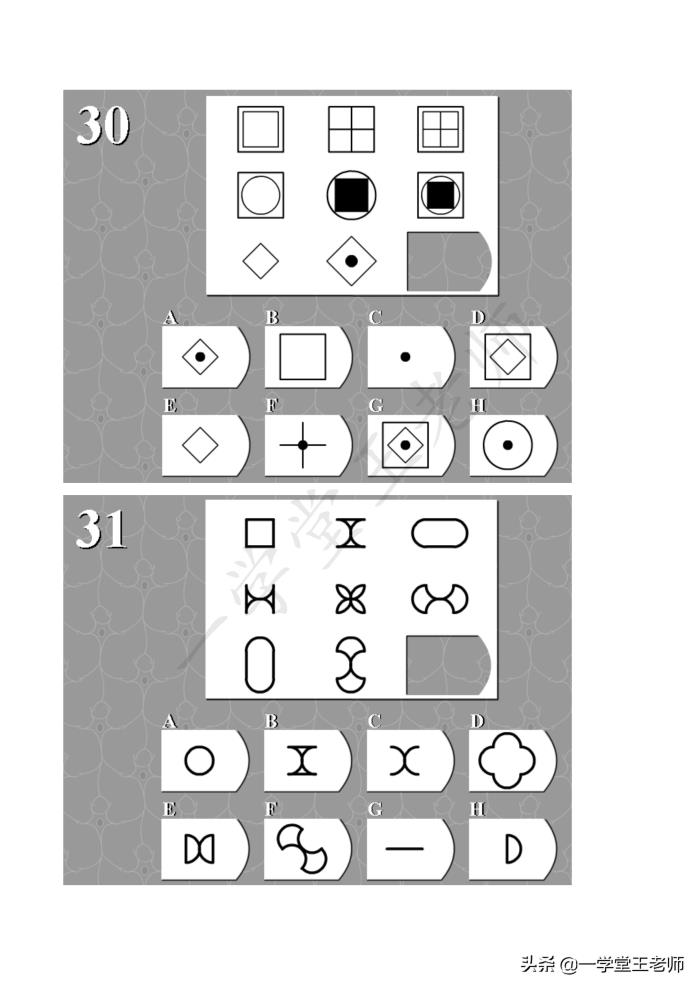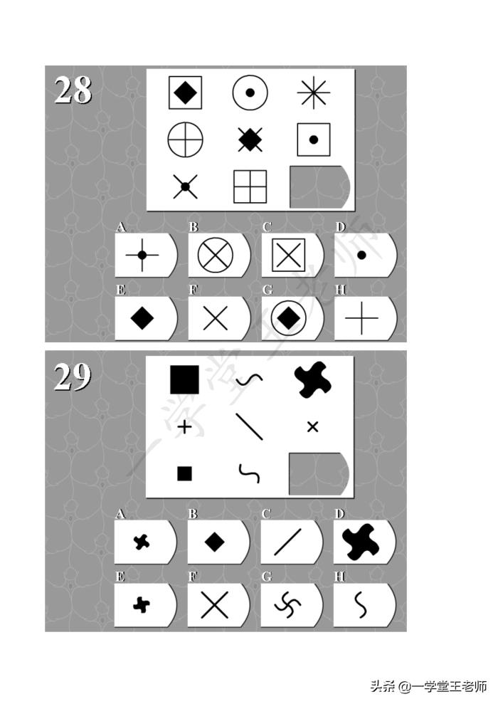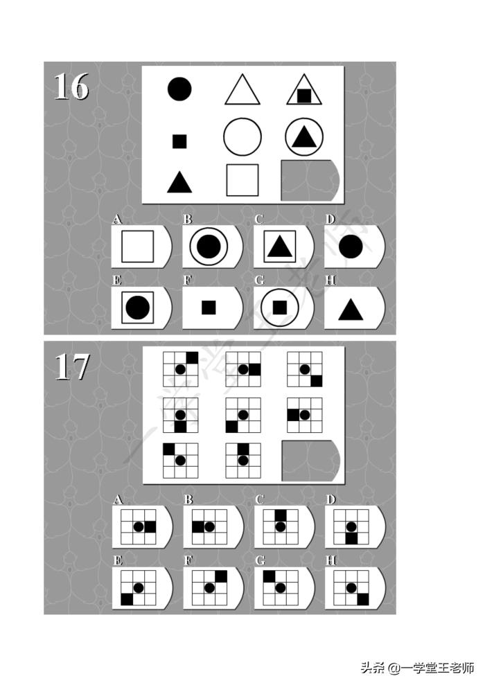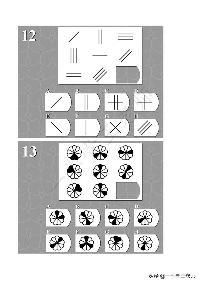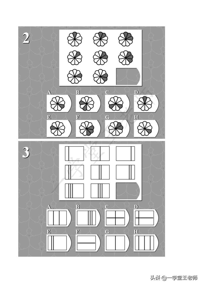 每个题目中图形都缺了一块,要从下面8个选项中,经过仔细的观察,归纳,推理,找出正确的那个答案。