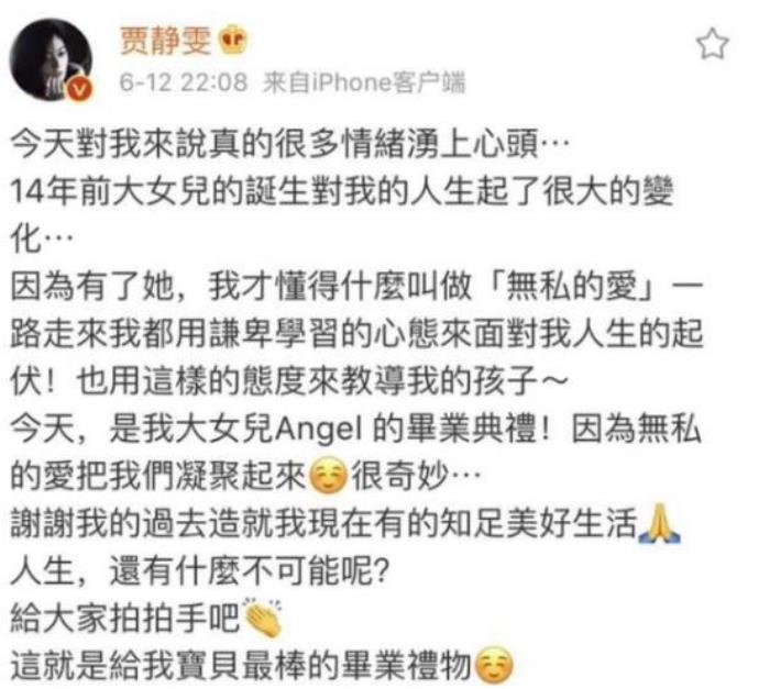 从这里也能看出,贾静雯与前夫的关系并没有网友想象的那样僵,虽然她与前夫的婚姻不幸福,但是懂事的梧桐妹无疑是她前半生最大的骄傲。