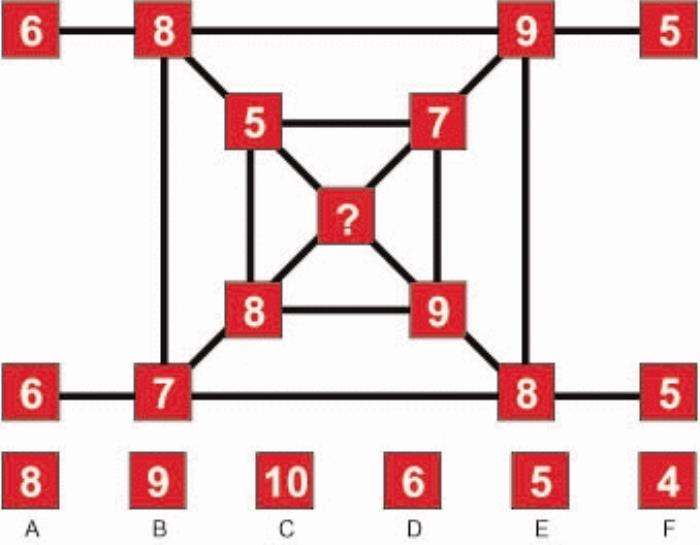 从A~F留个选项中选择一个数字填入问号处,以使从图中的某点出发,沿线相连(必须经过该问号处的空格)的5个数字之和刚好是40。