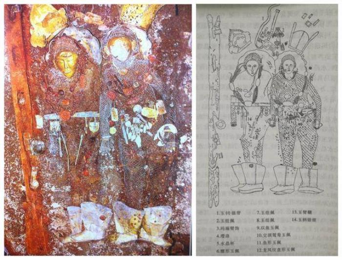 揭开他们外部的衣服,会发现他们两个全身穿着银缕衣。其中公主的头上还戴着金银冠,双耳带有琥珀、珍珠耳环,脖子上戴着珍珠项链,手腕上戴着金手镯,以及双手戴着11枚金戒指,脚上还穿着金花银靴,总而言之极尽奢华。