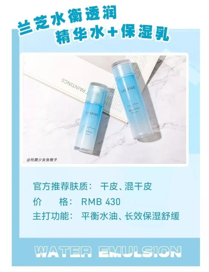 兰芝这套水乳老有名了!主打长效保湿和舒缓,还能平衡水油,价格适中,长得也蛮唯美的吼!