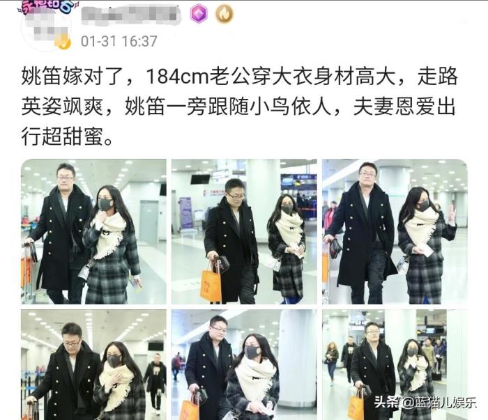 1月31日,有网友晒出姚笛与新婚老公出行的画面,并表示:姚笛嫁对了,184cm老公穿大衣身材高大,走路英姿飒爽,姚笛一旁跟随小鸟依人,夫妻恩爱出行超甜蜜!