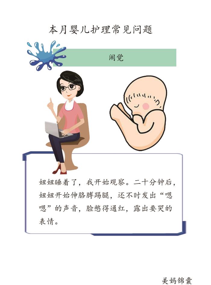 孩子“闹觉”,常使一些父母心烦,甚至对孩子发脾气。殊不知孩子“闹觉”的毛病,常常是大人给养成的。新生儿的大脑发育还不健全,生后几乎大部分时间都处在睡眠状态,每天大约有18~22小时在睡眠中,只有短时间清醒。清醒后很快就会感到疲倦,这时孩子常以“哭”表示他累了,只要环境安静、舒适,片刻后孩子就本能地自然入睡。