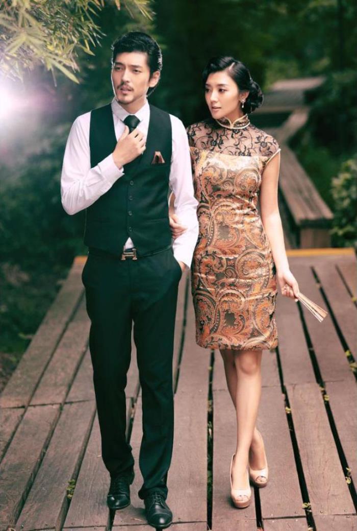 对于成熟的新郎来说,帅气笔挺的衬衫马甲搭配西裤和皮鞋,给人一种很man的男人味,新娘一袭复古的刺绣旗袍装,展现妖娆的身材同时,又摇曳着复古优雅的韵味,领肩蕾丝浪漫又唯美,大身高贵又华美,踩一双高跟鞋,搭配一头温婉的发髻,手持折扇,两人款款走来,写不尽的情调。