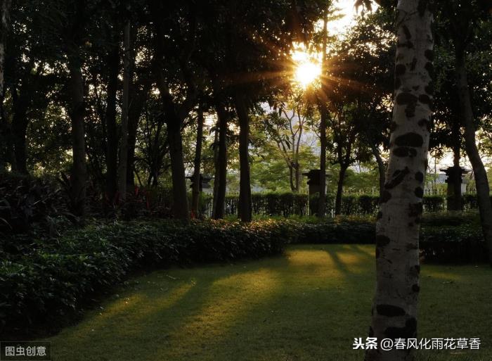 7. 灿烂的阳光穿过树叶间的缝隙,透过薄雾,洒满了校园。