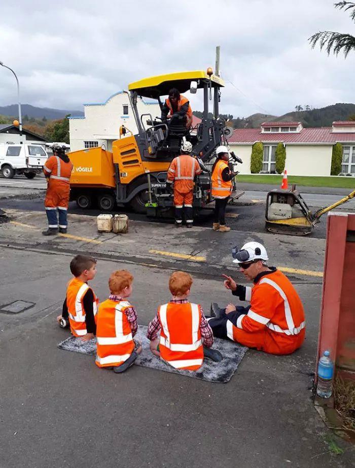 道路作业员在工作的时候遇到几个很有兴趣的小朋友,于是他坐下来给他们详细的讲解了起来。