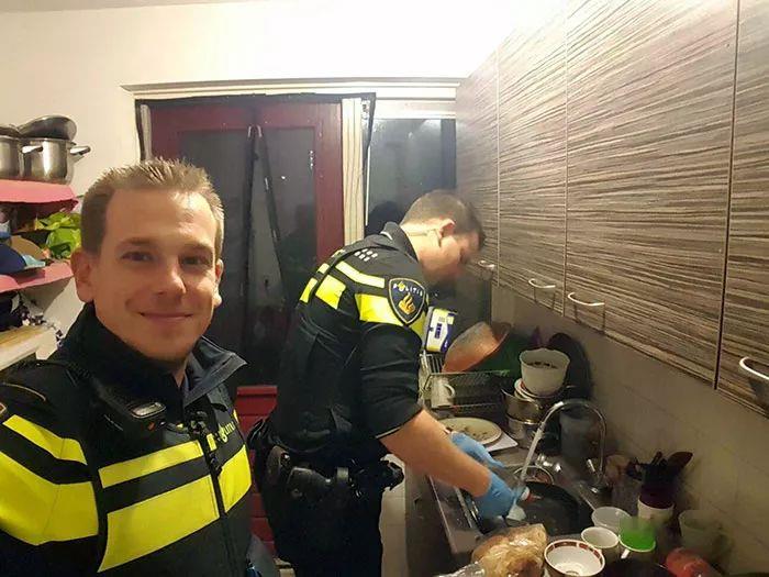 一个妈妈因为低血糖被送到医院了,她的家里还有五个孩子,于是这些警察留下来给他们做了晚餐,还洗了碗。