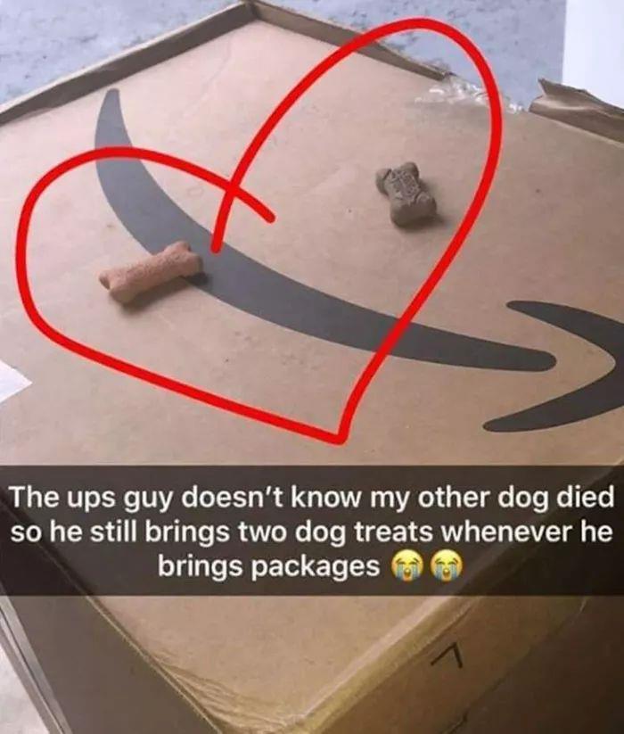 这家人养了两只狗,所以邮递员每次都会在他们的快递上放两个狗饼干。