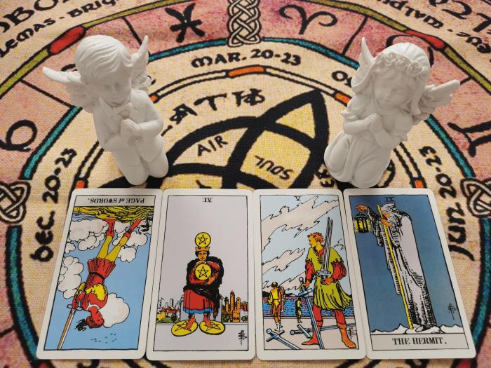 宝剑侍从逆位 星币四 宝剑五 隐者
