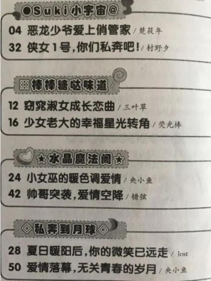 喜欢台湾言情风,就买《飞言情》;不喜欢悲剧结尾,《阳光smile》包你满足;想走文艺路线,《花火》就是不二选择;要体验真实的青春故事,《男生女生》或《爱格》就足够。