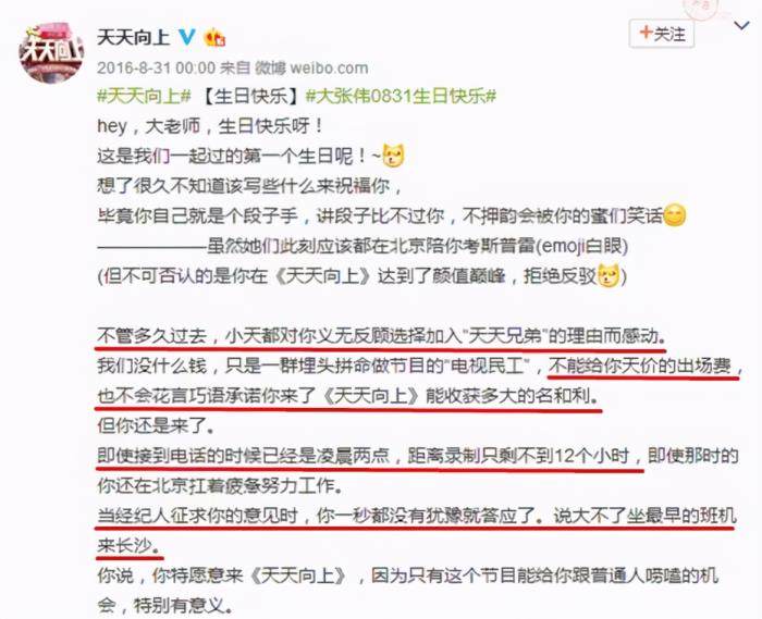 等到8月份大张伟生日,《天天向上》官方为大张伟庆祝,发的文案是特别感谢大张伟的义气相挺,半夜2点接到电话一秒都没犹豫的就坐早班机来了。来了他要熟悉台本要和汪涵、钱枫沟通怎么配合才能好。