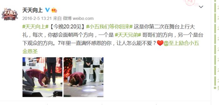2015年底,小五入伍,《天天向上》少了一个小鲜肉会少很多的年轻流量,立即开展“天天小兄弟”征选活动,这其中有刘昊然、王一博、许魏洲、彭昱畅等都在舞台上比赛。
