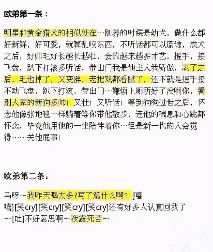 这时欧弟发了在社交平台发了一篇大意是年老的黄金猎犬,把戏看多了遭主人的嫌弃的长文。