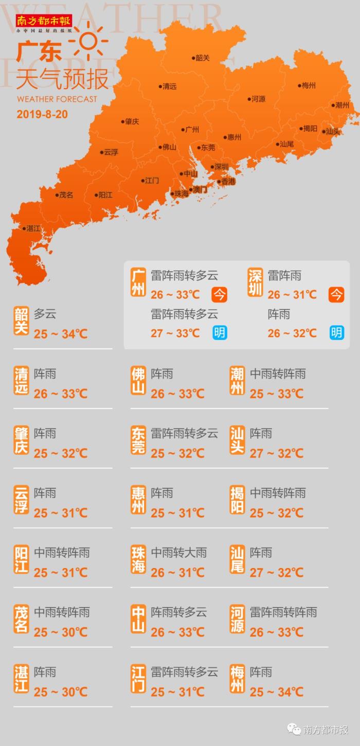 20日,雷州半岛有中到大雨,局部暴雨,珠江三角洲南部、粤东、茂名、阳江有(雷)阵雨局部大雨,其余市县多云有分散(雷)阵雨;最高气温:中北部和粤东33℃~35℃,西南部沿海29℃~32℃。