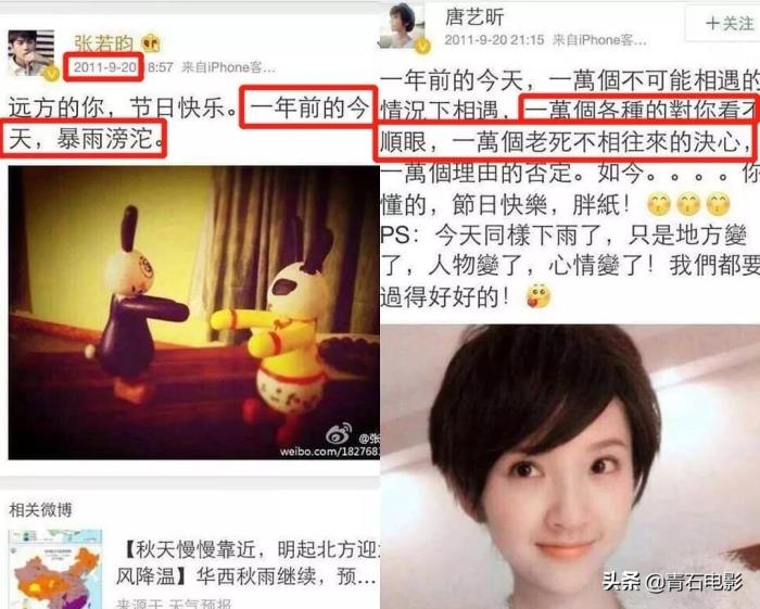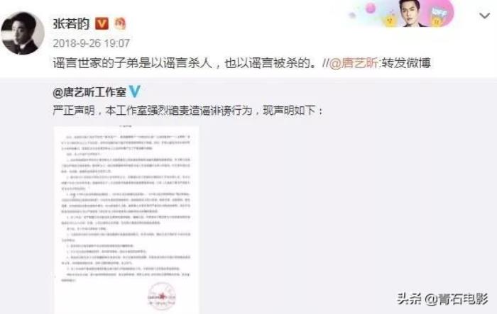 比如此前在唐艺昕和吴秀波绯闻传得沸沸扬扬的时候,张若昀就亲自转发了营销号的内容,下场开怼: