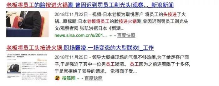 在2015年12月,一家位于东京涩谷区的公司年会上,老板要求一名男性职员“做一些有意思的事”,职员拒绝后,老板抓住该职员的脖子,两次将他的脸按入沸腾的火锅,造成职员面部烧伤。令人震惊的是,直到三年后,该职员才有勇气将这件事向社会公布。比起自己身体上所受到的伤害而言,他更担心的是老板会生气。