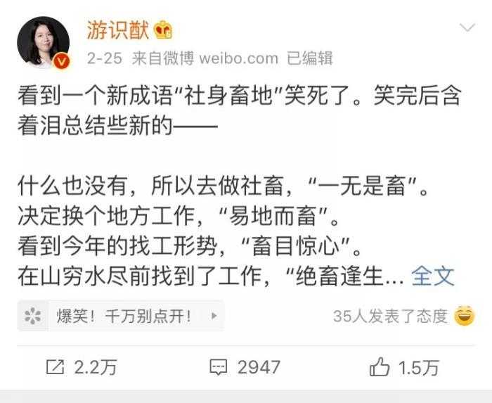 微博账号“社畜茶水间”主要分享社畜在工作上的大事小情,有时只是发泄情绪,粉丝量达到15万,日发博数只有10条左右的情况下阅读数竟然超过100万,互动数在5000上下。博主“游识猷”发布的关于社畜的新词语“社身畜地”、“一无是畜”等的微博获得了超过2万的转发量。