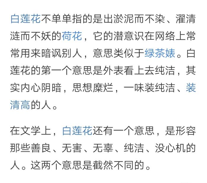 白莲花,外表清纯无辜,永远一副我是纯洁的我什么都不知道,表现的不谙世事,一副我是弱者的样子,对她好的人,一般没事,但是和她作对的人,不好意思,你得等着身边的人不断被误导,被分化,然后你被孤立。圣母白莲花其实是人们比较讨厌的一类人。冷艳高贵温柔柔弱善良乐于助人舍己为人但这个主要是贬义的多一些,大多数使用来吐槽那些角色的比如说善良到给自己身边的亲朋好友惹了一堆麻烦,柔弱到别人一批评就泪花涟涟啊什么的。