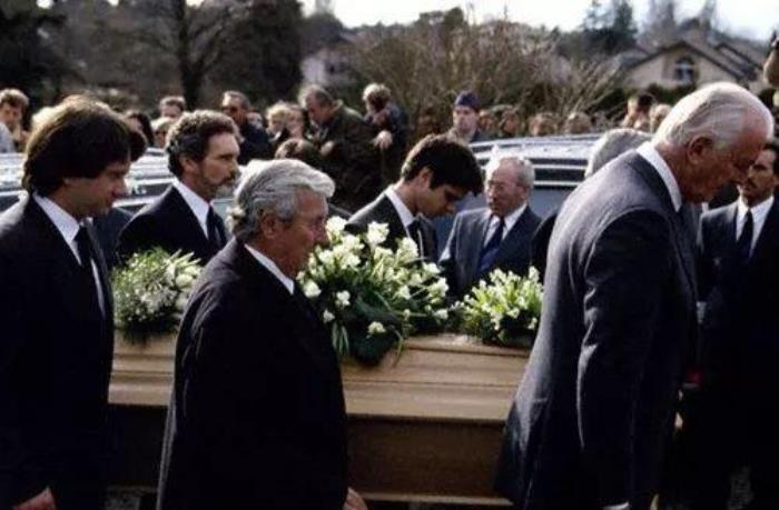 纪梵希默默低着头,和赫本的丈夫和儿子抬着灵柩,陪她走完了人生的最后一程。