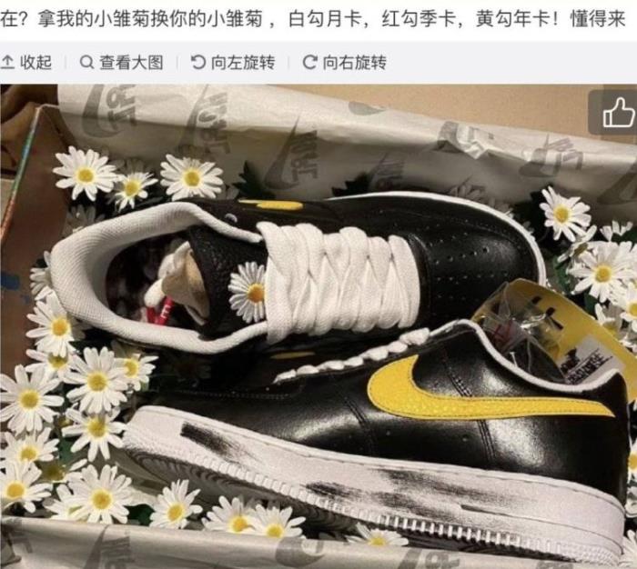 很快,闲鱼、微博、百度贴吧的对话列表里,就有人做起了球鞋的“生意”,也就是让小姑娘把照片发给这些“雏菊男”,据说看中了以后,“雏菊换雏菊,一鞋睡三晚”。