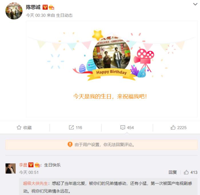 另外,和陈思诚曾经合作过《士兵突击》和《北爱》的李晨也在陈思诚微博下送上了生日祝福。